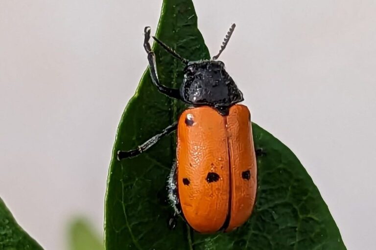 El escarabajo de seis puntos se parece a una mariquita alargada. Tiene los élitros anaranjados, alargados y con 3 puntos negros cada uno.